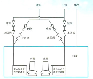 含有雜物的污水,由排水管線進入設備的污水流人口,再經過水箱內的過濾室將污水中所含雜物進行分離(雜物暫存于過濾室內),無雜物的污水流入水箱蓄水池。當蓄水池充滿后,控制系統(tǒng)自動啟動水泵,反方向向過濾器排水,由